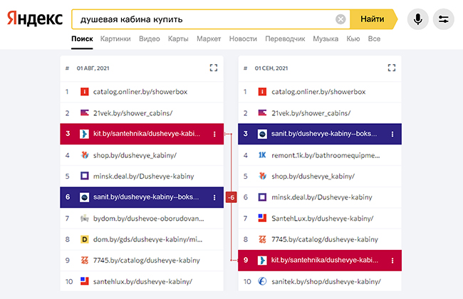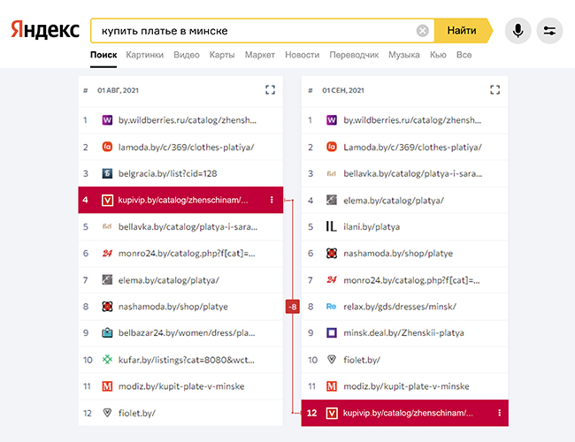 Kupivip.by, один из лидеров июля, едва ли не остался за пределами таблицы (-12,39%)— такие значительные перестановки связаны со снижением позиций в Яндексе.