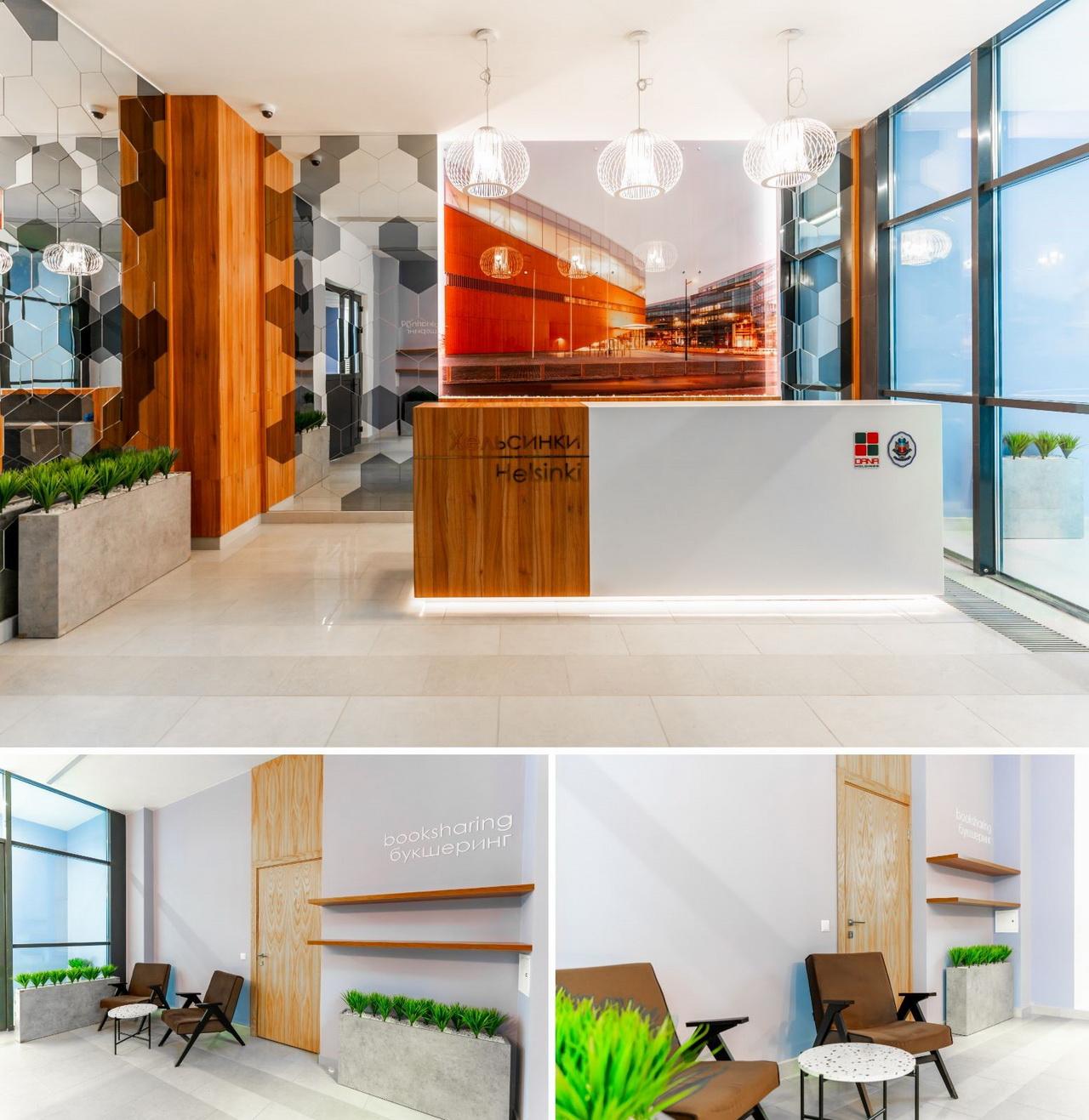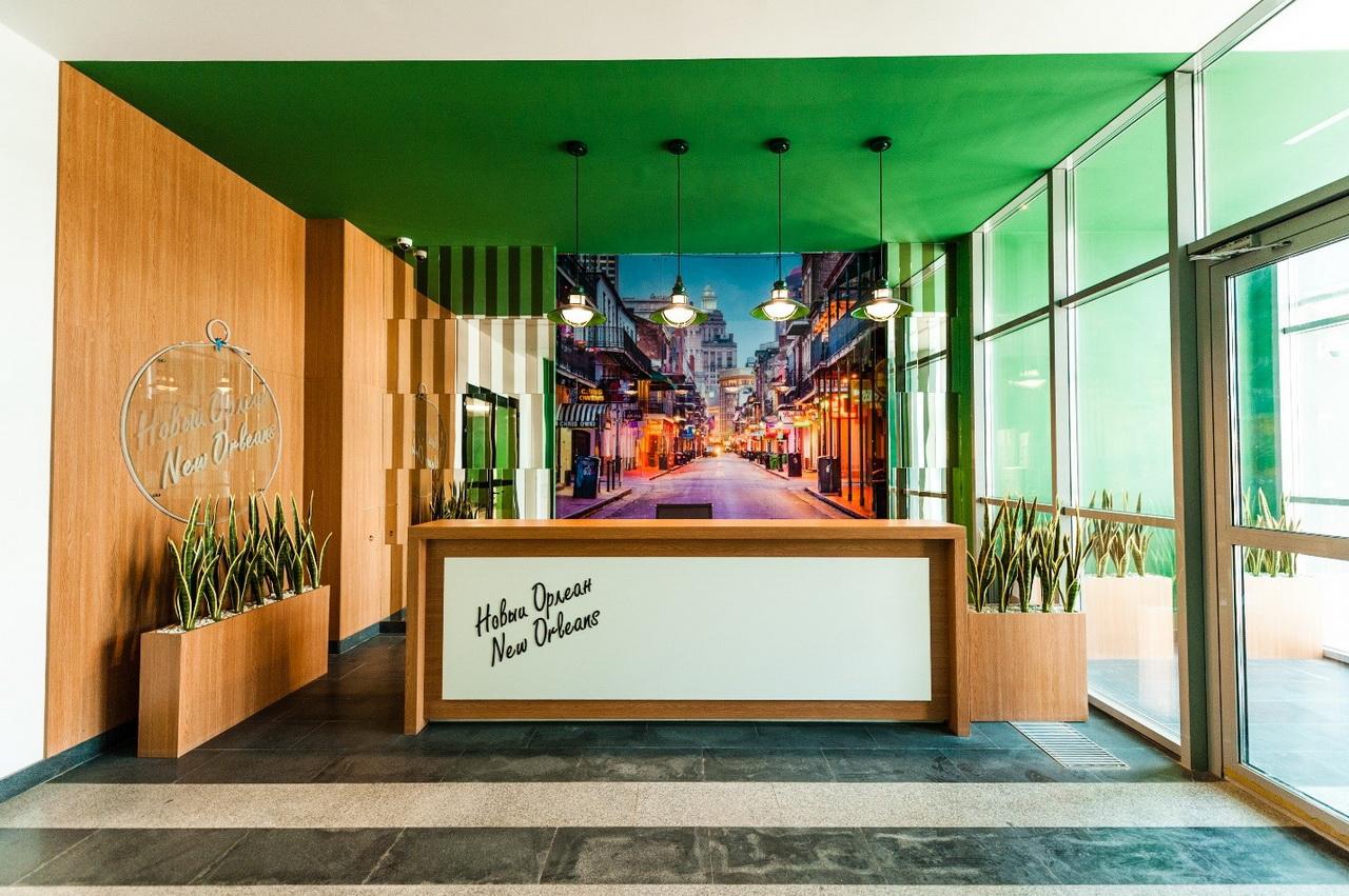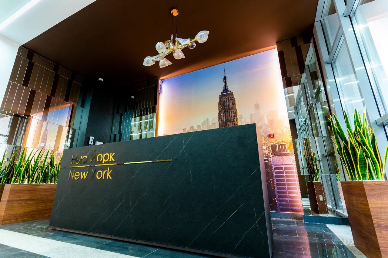 - начинаются с территории комфорта — эксклюзивного дизайнерского лобби, где есть стойка для консьержа, санитарная комната с пеленальным столиком, лапомойка для четвероногих друзей, место отдыха для приёма гостей и деловых встреч с букшерингом.