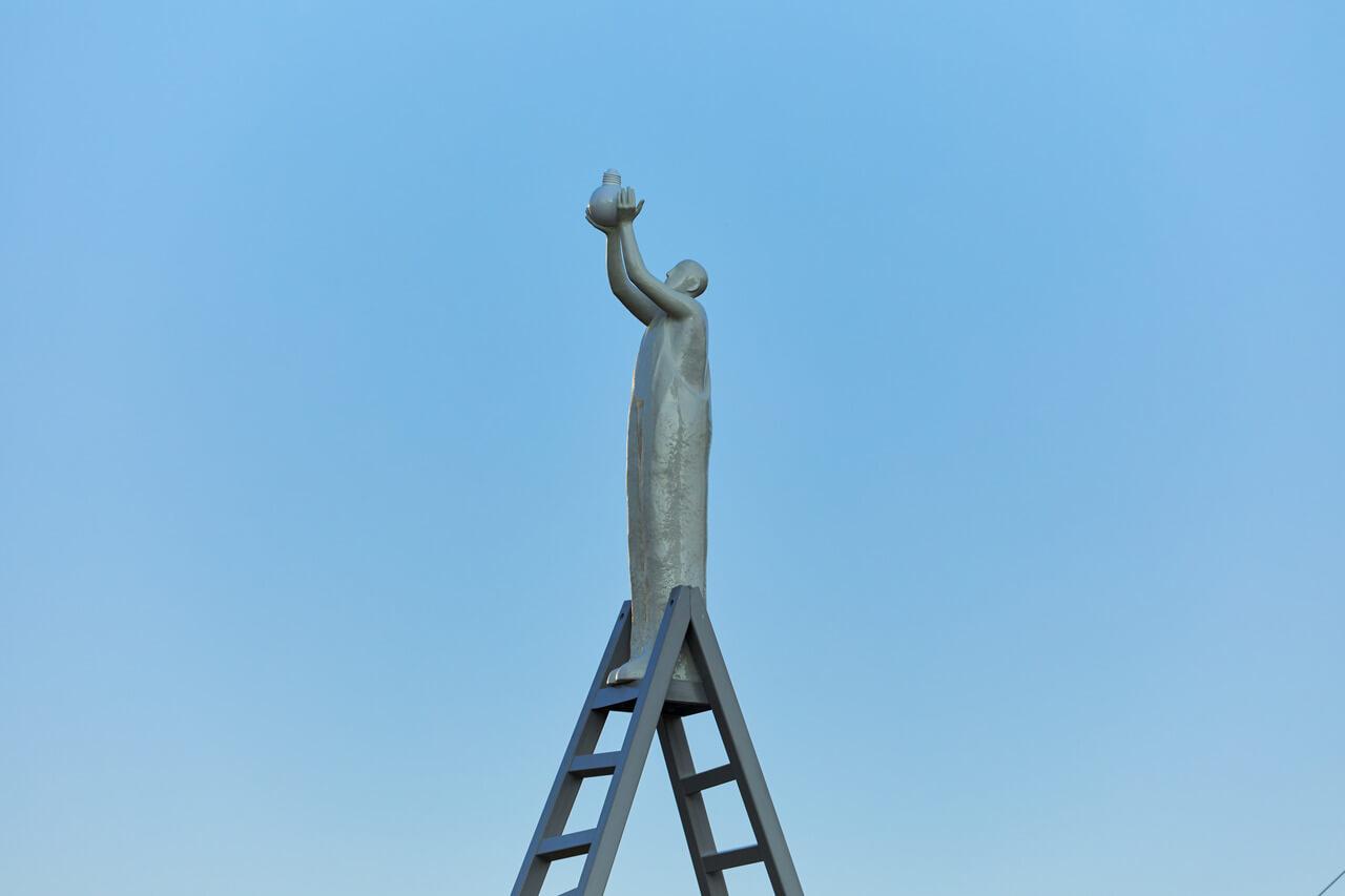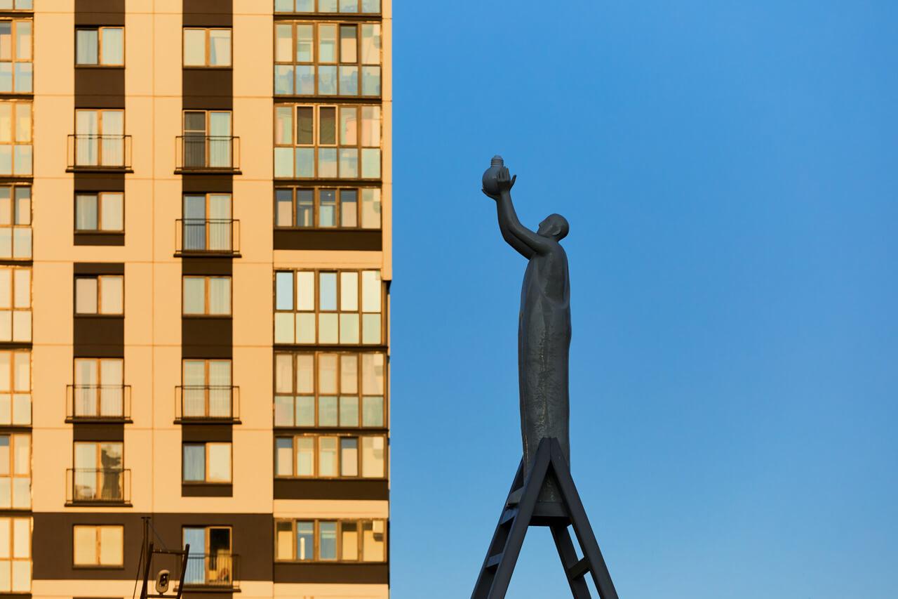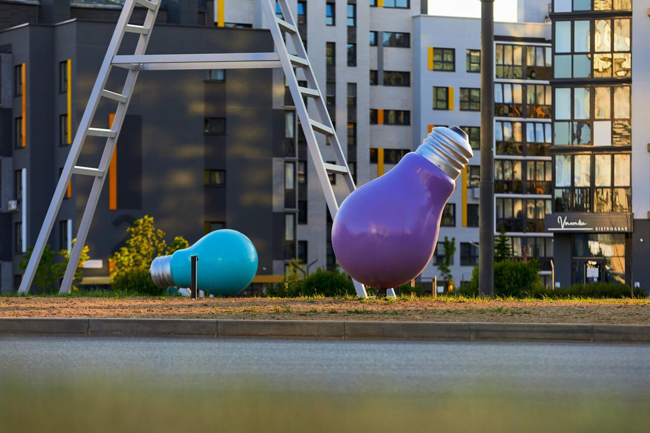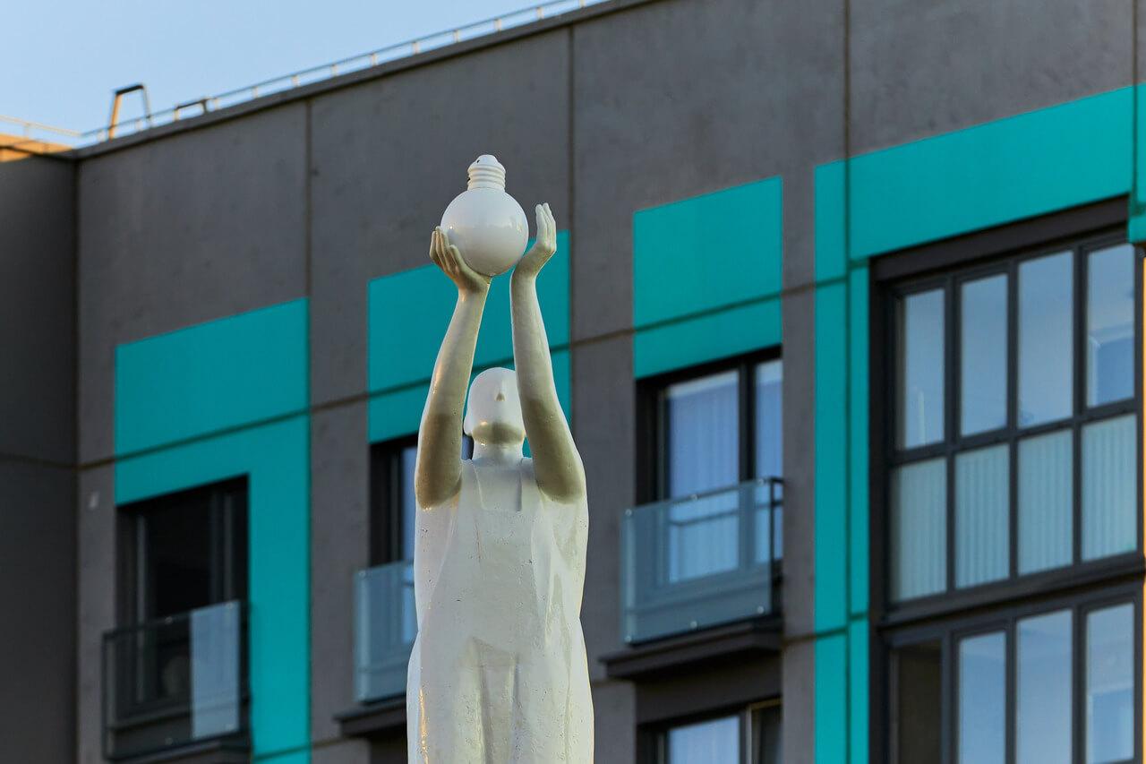 Тема света и обновления продолжается и во втором арт-объекте под названием «Меняем свет». Именно с такой целью поднялся на лестницу персонаж с лампочкой в руках, стремясь сделать район еще более ярким и заметным. Этот человек – собирательный образ строителя, знакомый каждому жителю района: с него начинается возведение любого дома и квартала, а лампочка в его руках – это финальный момент перед тем, как новое место обретёт своих жителей.