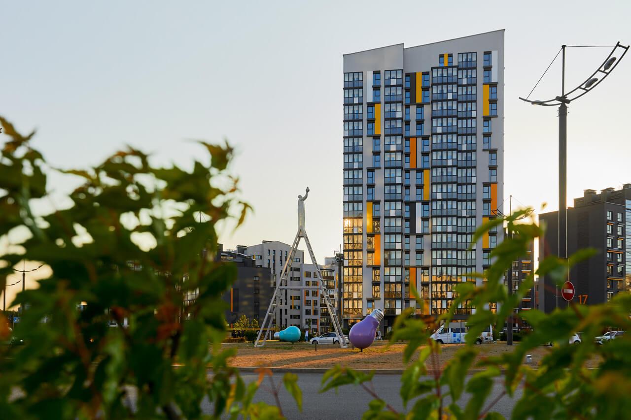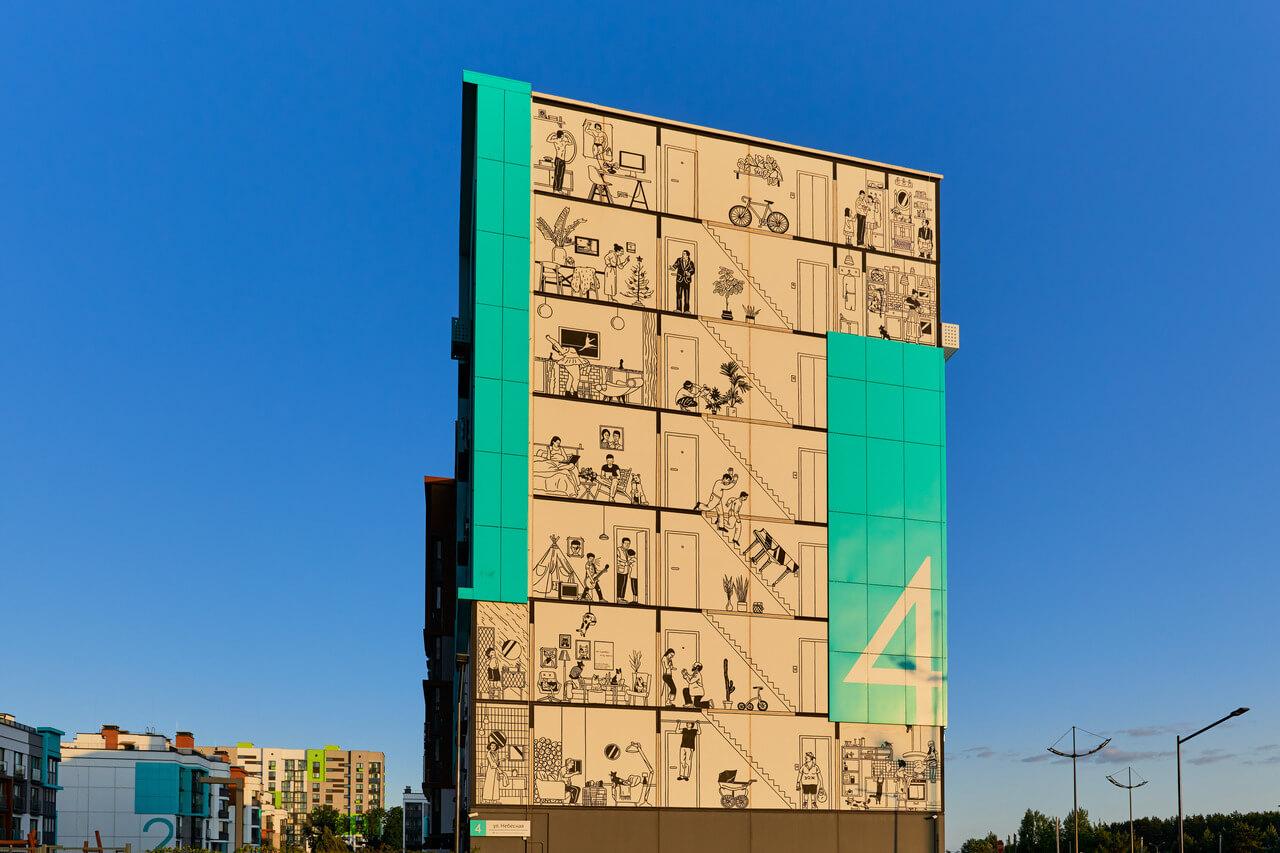 Деликатно и нативно внедрять искусство в свои проекты компания «А-100 Девелопмент» начала достаточно давно. Сначала это были интуитивные попытки сделать среду более разнообразной и живой. Например, рисунок девочки с шарами на фасаде жилого комплекса «Зеленые горки». Далее это направление нашло отражение в Новой Боровой. В первых кварталах начали появляться муралы: «Витрувианский человек» Да Винчи и мурал Мити Писляка. А затем – узнаваемые «Красный фонарь» и желтый жираф, которые уже стали символом Новой Боровой.