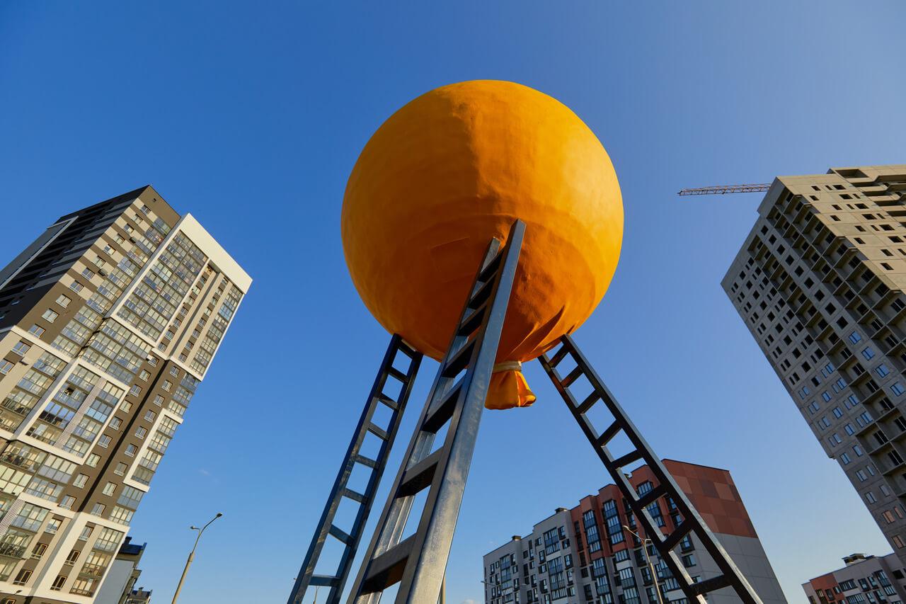 Арт-объект «Вверх» представляет собой воздушный шар, который словно стремится взмыть в небо и даже лестницы не способны сдержать его порыв ввысь. Яркий жизнерадостный цвет шара и его форма напоминают солнце, которое даже в пасмурный день способно наполнить ярким светом и энергией всю Новую Боровую. Ощущение взлета и парения, оптимизма и душевного порыва – вот те ценности, которые стремились воплотить в своей работы авторы, вдохновившись самой локацией и её жителями.