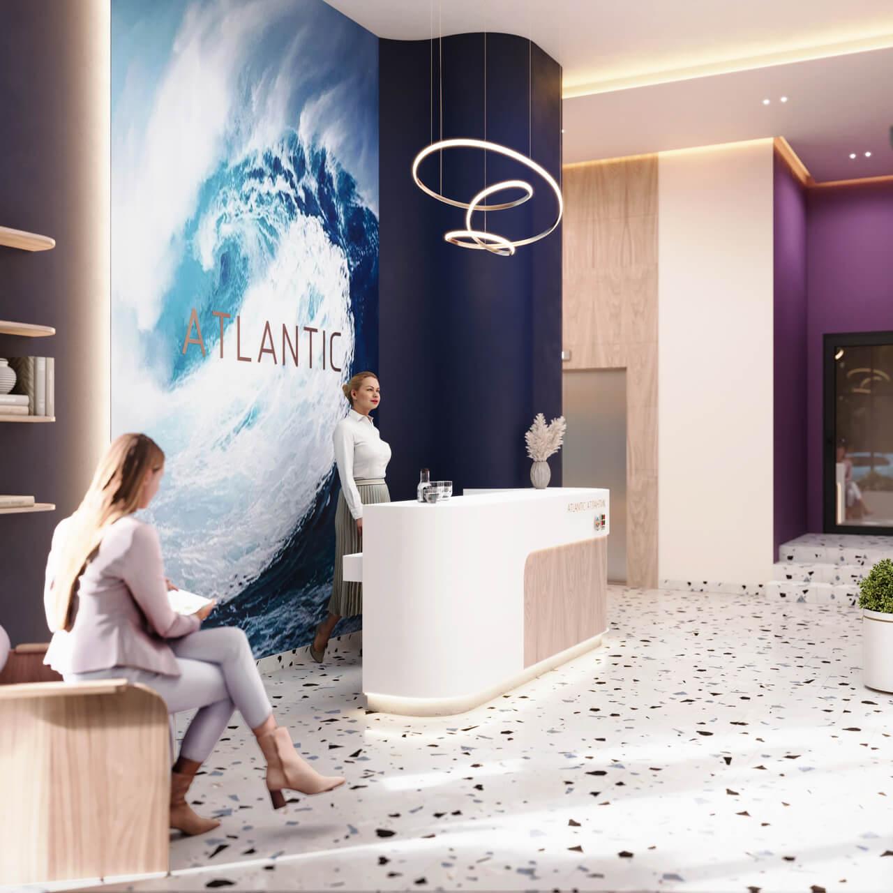Как и в других домах многофункционального комплекса, застройщик проявит максимум заботы о маленьких и взрослых жителях дома, а также гостях «Атлантики». Предусмотрена туалетная комната с пеленальным столиком, колясочная, место отдыха для гостей, где будет небольшой букшеринг (библиотека). Лобби домов Minsk World часто сравнивают с фойе дорогих отелей — тандем высокой эстетики и практичности, безопасности и комфорта.