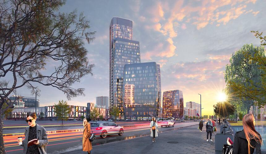 Квартал возводится в самом сердце многофункционального комплекса. В его центре выделено место под строительство школы, из окон жилых домов в южном направлении открывается вид на обширную озелененную территорию, таунхаусы и городские виллы, выставочный центр и спортивный комплекс. В ансамбль из современных 25-этажных домов вплетено здание общественно-торгового назначения.