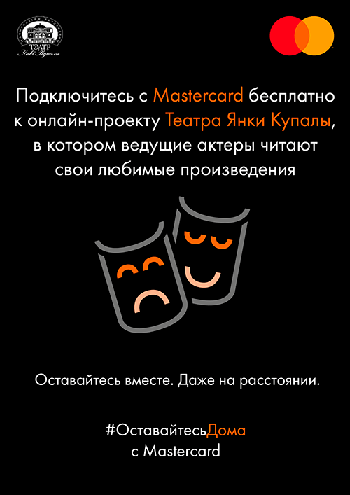 Являясь генеральным партнером Национального академического театра имени Янки Купалы, Mastercard поддерживает новые форматы, которые предлагает театр. При содействии Mastercard в настоящее время идет онлайн-проект «Чытаць я хацеў», в котором ведущие актеры театра каждый день с 16 по 29 апреля читают в прямом эфире свои любимые рассказы и сказки белорусских и зарубежных авторов. Трансляция доступна для всех желающих в Instagram.