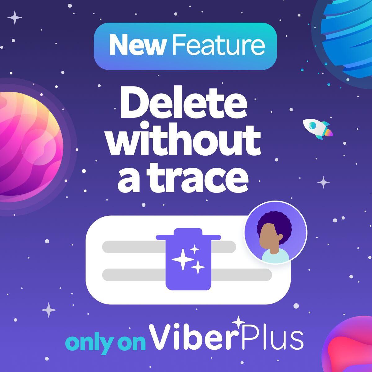 Функция “Удаление без следов” доступна только пользователям премиум-подписки Viber Plus, которая предоставляет дополнительные возможности для удобного и комфортного общения, в числе которых особая метка аккаунта, неограниченный доступ к стикерам, прямая связь с поддержкой и многое другое. На данный момент самой популярной функцией, которую используют более 72% пользователей Rakuten Viber, является “Режим невидимости”.