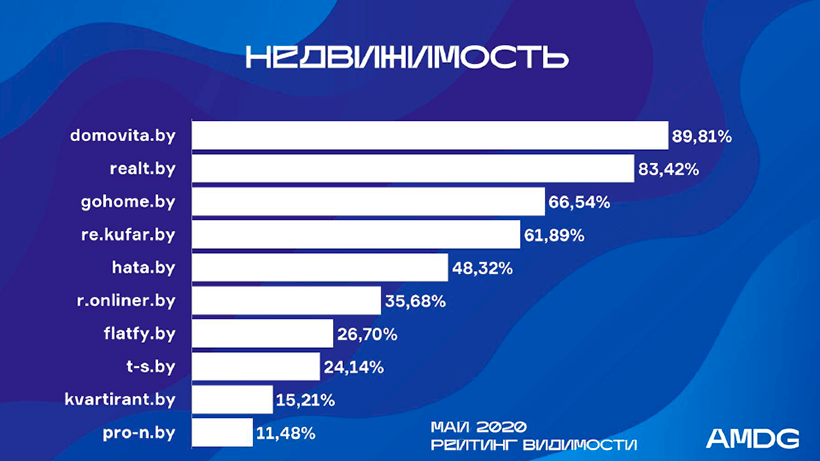 Как и в банковской категории, в рейтинге недвижимости топ-участники сохранили свои позиции, несмотря на серьезные изменения. Так, в апреле снизился спрос на покупку и аренду недвижимости, рынок коммерческой недвижимости замер. Но уже в мае обозначился рост, что позволило лидерам рейтинга Domovita.by и Realt.by укрепить позиции и повысить видимость по самым частотным запросам, к примеру, «купить квартиру».
