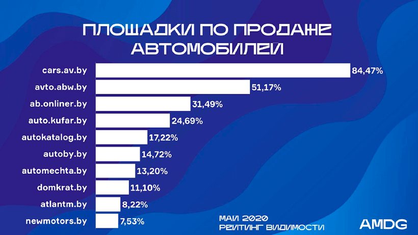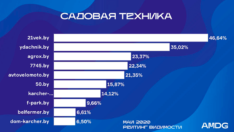 Аvtovelomoto.by опустился с 3-го места в апреле на 5-е в мае, потеряв 3,4% видимости. Его место в тройке занял Agrox.by (прирост – 4%).