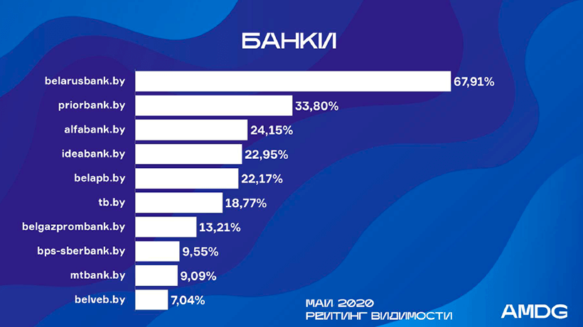 Беларусбанк уже не первый год занимает первую строку рейтинга: с майским показателем видимости в 67,91% он лидирует с большим отрывом от остальных.