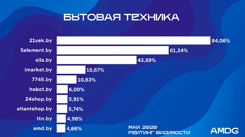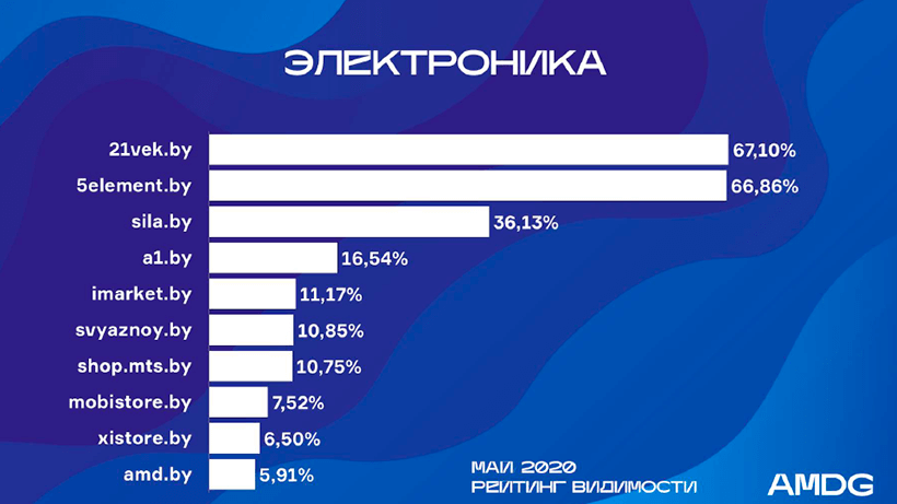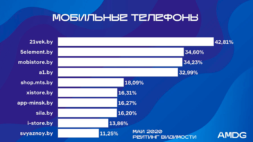 У первой пятерки лидеров – 21vek.by, 5element.by, Mobistore.by, A1.by, Shop.mts.by – заметна просадка видимости в сравнении с апрельскими показателями, однако большинству участников удалось сохранить ранее занимаемые позиции. Единственная перестановка – снижение видимости Mobistore.by на 7,5% позволило «5 элементу» занять 2-е место.