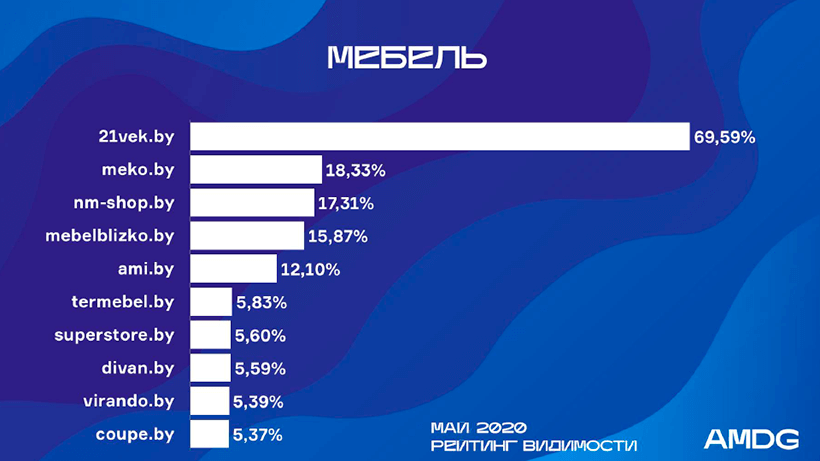 Сайты Pinskdrev.by, Aksamit.by, Mersi.by выпали из ТОП-10, занимая теперь 11-е, 12-е и 14-е места. В десятку зато попал Superstore.by, восстановивший свои мартовские позиции, а также новички Divan.by и Coupe.by.