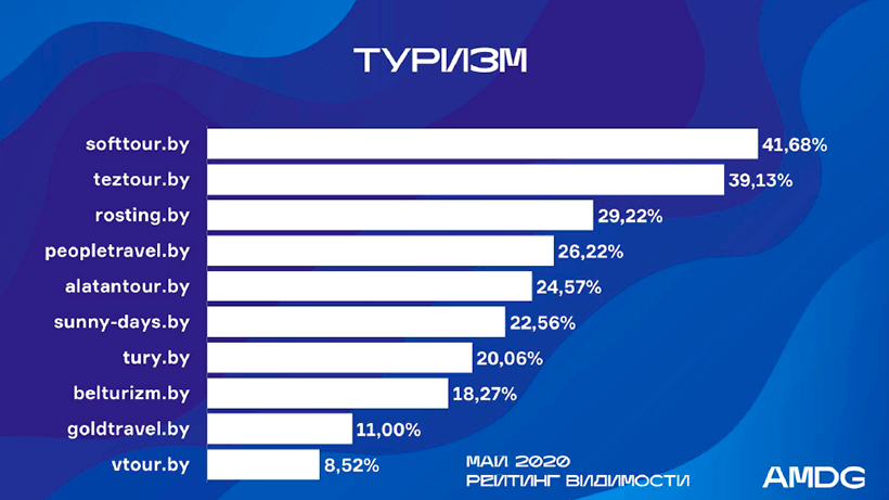 В категории «Туризм» наблюдается сильная волатильность показателей. Так, прежние лидеры «АлатанТур» (2-е место в апреле) и «Белтуризм» (3-е место в апреле) в мае спустились на 5-е и 8-е место соответственно, потеряв более 15% видимости.