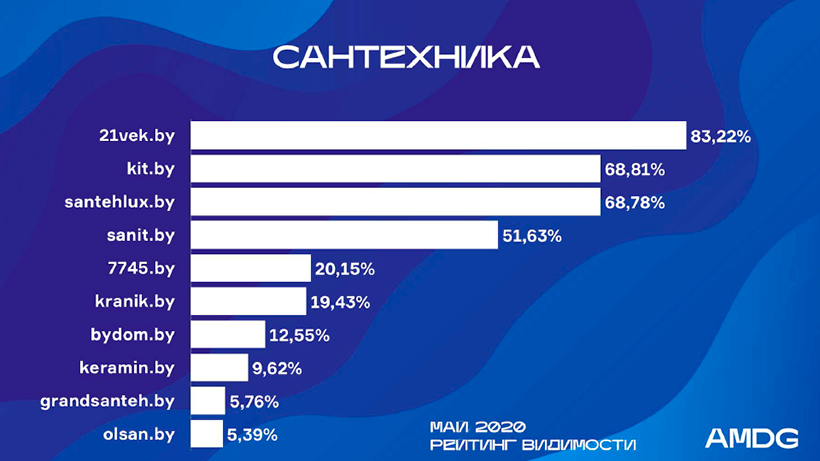 Тройка лидеров осталась прежней. Santehlux.by вернулся к мартовским показателям после снижения в апреле: +12% и 2-я строка рейтинга.
