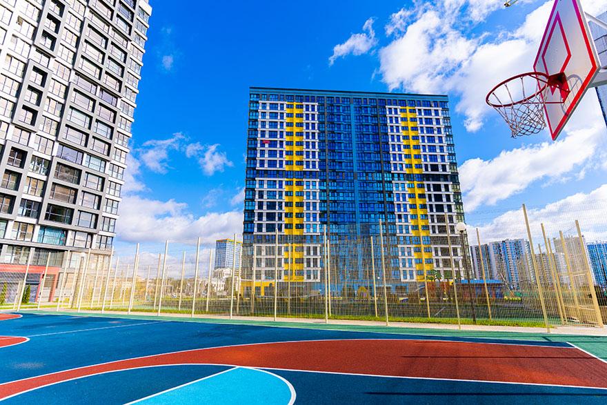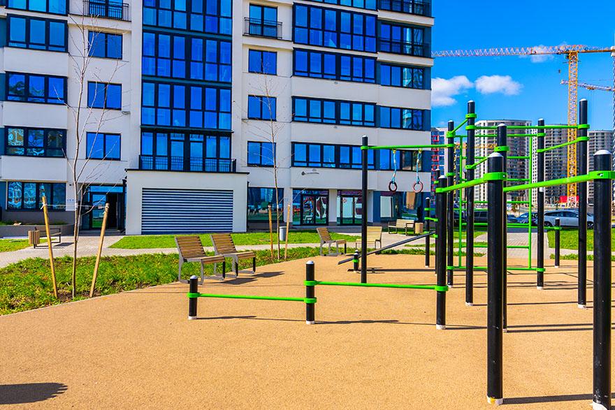 Хотите быть в форме? В кварталах обустраиваются зоны воркаута (не придётся искать, где «упасть и отжаться»), рядом теннисные корты, площадки для футбола, баскетбола и волейбола!