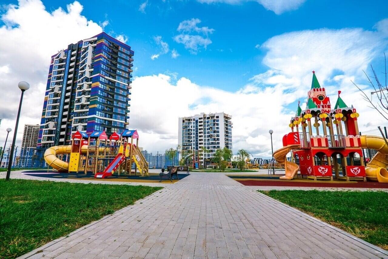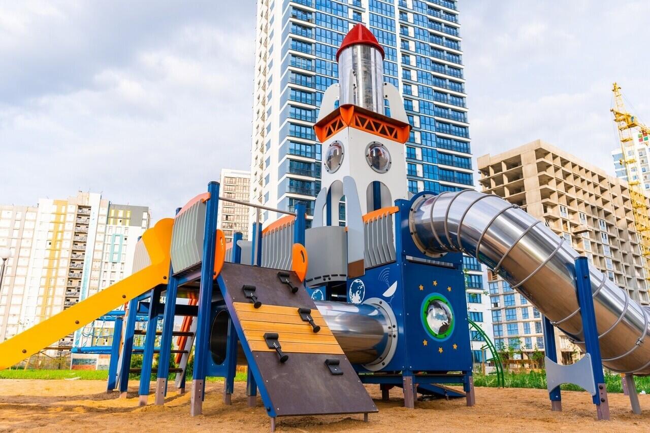 - Игровые площадки для малышей на полностью безопасных прилегающих территориях домов, где исключено транзитное движение транспортных средств. Детские площадки невероятно интересные и красочные! Они созданы в виде сказочных замков, парусников, кораблей, таинственных лесных домиков и дворцов или космических ракет. Они напоминают миниатюрные парки. Малышам здесь интересно и безопасно.