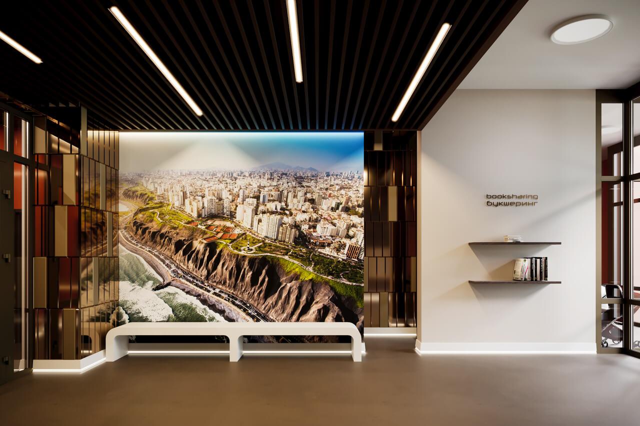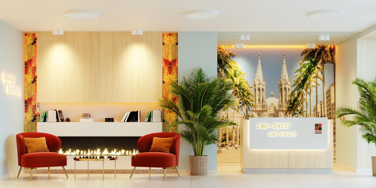 - Эксклюзивные дизайнерские лобби — жителей и гостей встретят роскошные фойе с мягкими зонами отдыха, тематически оформленными стенами, на которых изображены достопримечательности городов, функциональными санитарными комнатами для родителей и детей, стойкой консьержа, букшерингом.