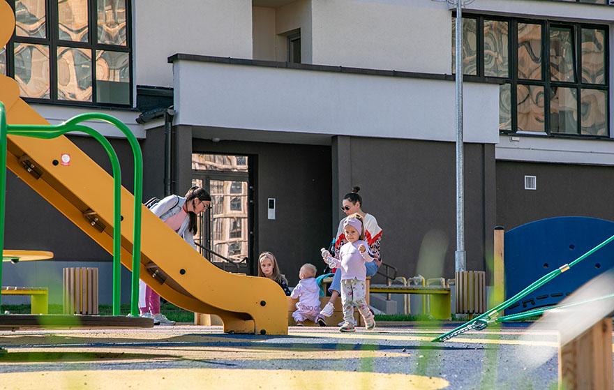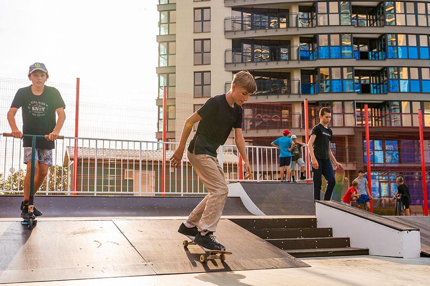 В центре квартала запроектирован детский сад, а кроме детских и спортивных площадок есть уличные тренажёры, площадки для занятия воркаутом и современный скейт-парк. Всё лето новой локацией наслаждались подростки. Детей отпускать сюда можно без страха об их безопасности – автомобильные парковки вынесены на периферию квартала, транзитное движение транспорта исключено.