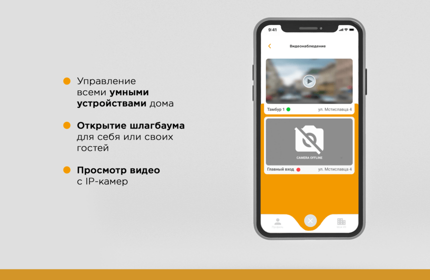 Используя мобильное приложение, вы сможете воспользоваться услугой «Паспортный стол», а также легко управлять всеми умными устройствами вашего дома. Например, просматривать видео с IP-камер или поднимать шлагбаум перед автомобилем приехавших к вам гостей.