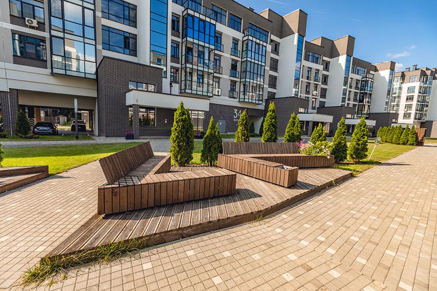 Во дворах «Олимпик Парка» предусмотрены стильные пешеходные дорожки, газон и туи.