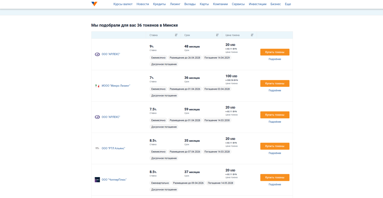 Ведущий финансовый портал Myfin.by и крупнейшая платформа по долговым токенам Finstore.by запустили первый в стране внешний листинг цифровых облигаций. Теперь белорусы смогут на одном портале сравнивать предложения и ставки доходности по банковским вкладам, облигациям и долговым токенам, соотносить эту информацию с актуальными курсами валют и принимать инвестиционные решения.