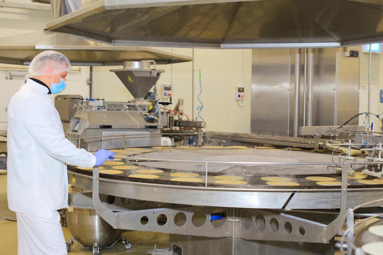 Каждая сковорода одновременно выпекает 50 блинов. Сначала тесто поступает на одну из них, а во время вращения блинчик подхватывает сковорода-близнец для двусторонней обжарки. На 9-метровом конвейере подается начинка, а после шоковой заморозки готовую продукцию упаковывают и отправляют по магазинам.