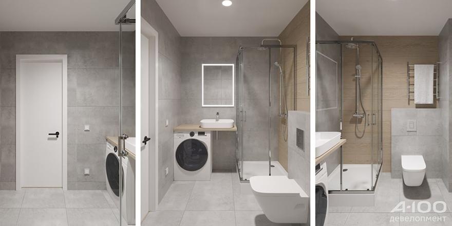 Готовым будет и санузел. В его отделке будет использована плитка «под бетон» или «под бетон и светлое дерево». Вместо ванны предусмотрена экономящая пространство душевая кабина. Продуманы подвесной унитаз с инсталляцией, умывальник со смесителем, столешница с тумбой и зеркало с подсветкой. В комплект также входят полотенцесушитель и стиральная машина.