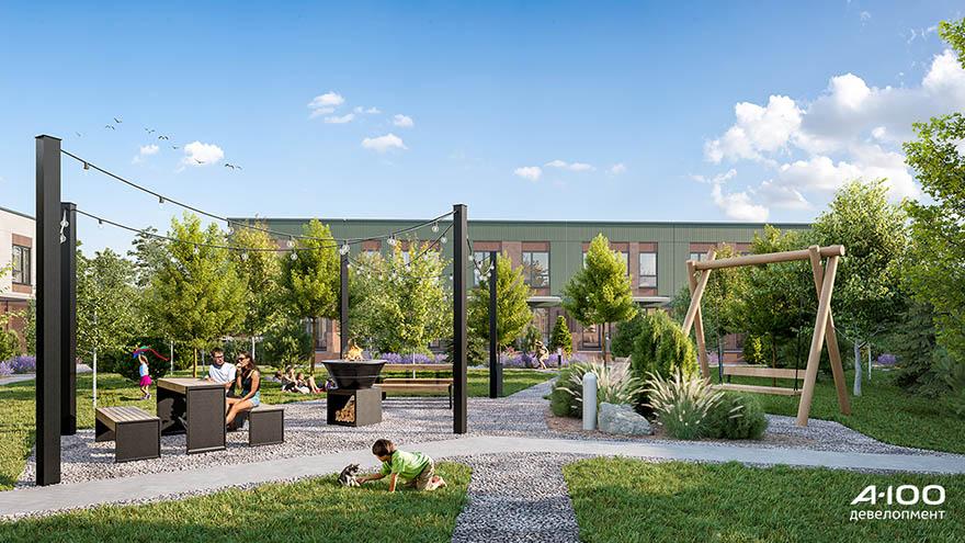 Своим расположением дома нового формата от застройщика образуют букву «П», внутри будет общий закрытый двор с зонами отдыха и барбекю. Внутреннее пространство — строго без автомобилей: парковки организуют за внешним периметром.