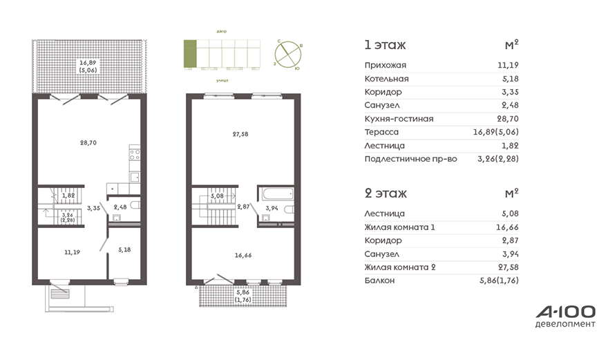 Первый этаж квартиры будет включать объединенную с кухней гостиную, коридор, гостевой санузел и мини-котельную. На втором расположатся две или три спальни, ванна и балкон над входом площадью более 5 кв. метров. Урбанхаусы будут выделять высокие потолки в 2,8 метра и панорамные окна «в пол». Каждая квартира будет отдельно отапливаться газовым котлом с закрытой камерой сгорания.