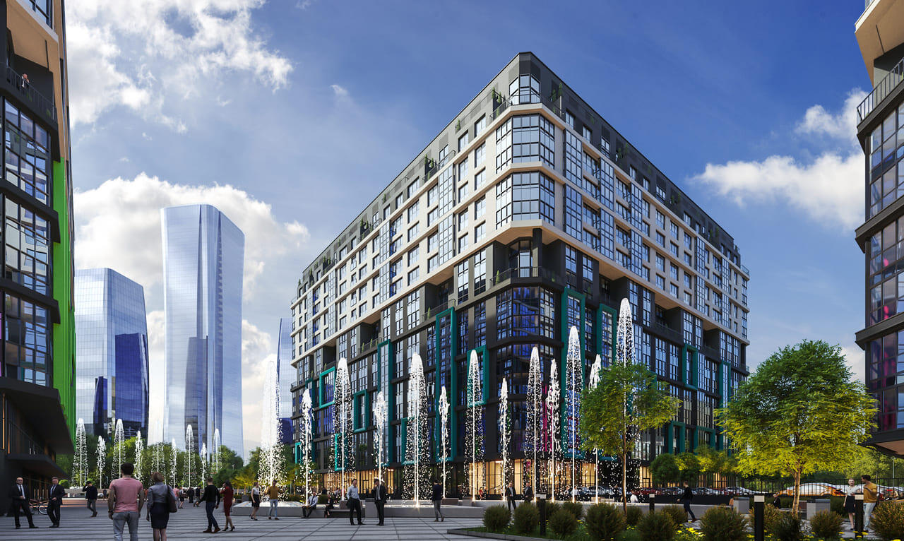 ⁃ Стратегическую локацию. Дом расположен в непосредственной близости от метро, строящегося Международного финансового коммерческого центра и крупного ТРЦ Avia Mall, что гарантирует стабильный рост ликвидности вашей недвижимости.
