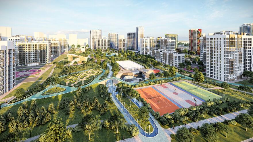 На территории нового городского парка появится места отдыха и развлечений для детей и взрослых. Здесь будут фонтаны, теннисный корт и стадионы для игры в баскетбол и волейбол.