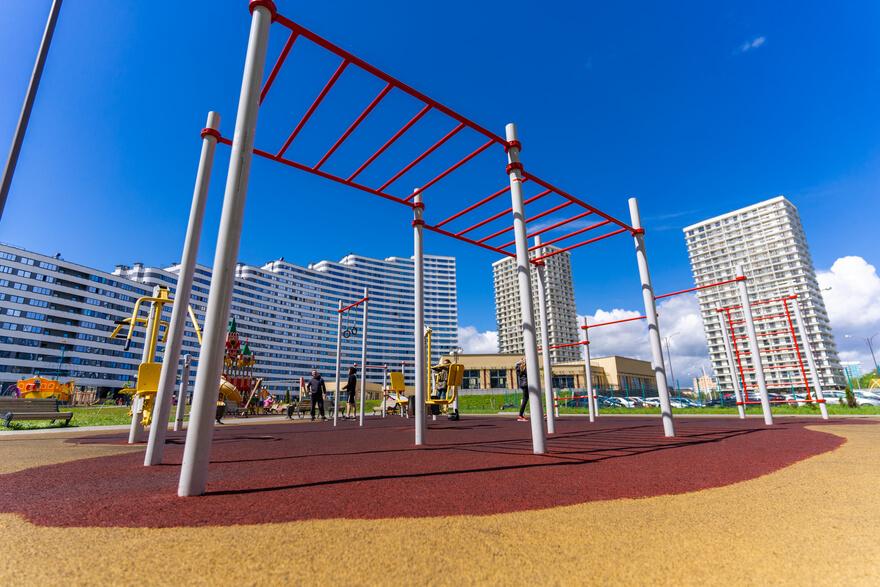 Один из выходов ведёт на прилегающую территорию квартала, где расположены красочные детские игровые площадки и территории воркаута.