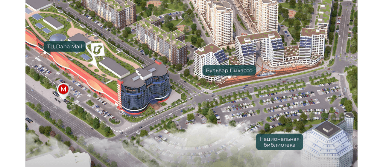 Многофункциональный комплекс удобен для жителей, гостей, и тех, кто ведёт в нём свой бизнес. Рядом огромная парковка (автостоянка у Национальной библиотеки), ещё один паркинг расположен в торговом центре Dana Mall. Всегда есть, где оставить автомобиль!