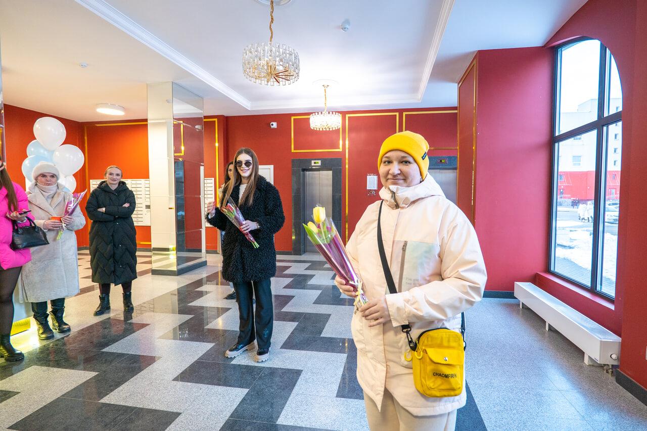 Оксана: «Сегодня, в канун праздника, в марте, в такой весенний день нам вручают ключи! Квартира нам понравилась. Качество хорошее. Очень красивый вид на сосновый парк, на закат солнца, на Минск. Мы довольны!»