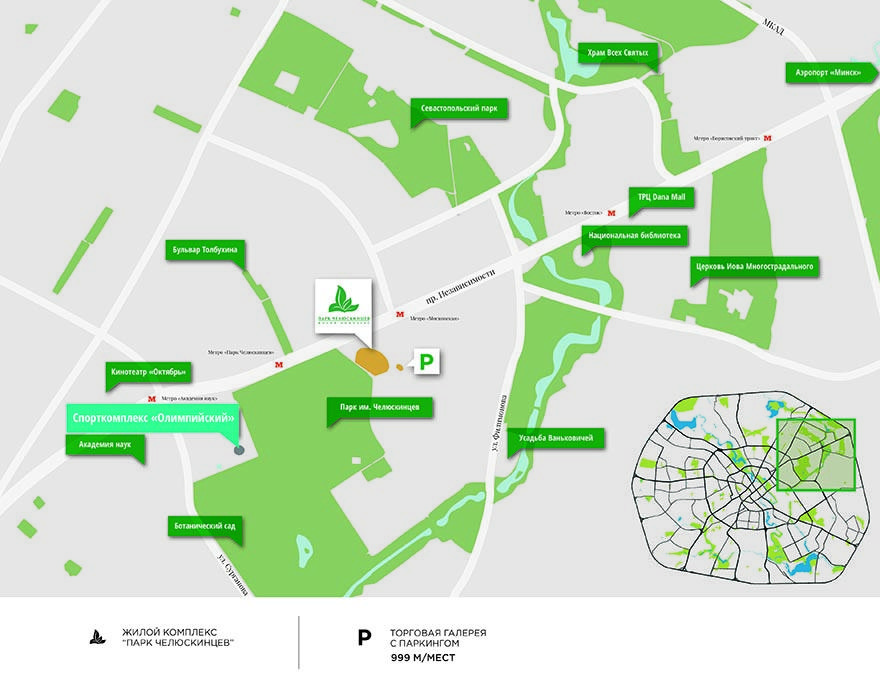 Комплекс располагается на пересечении проспекта Независимости и улицы Макаенка. В пешей доступности – остановки наземного транспорта и две станции метро – «Парк Челюскинцев» и «Московская».