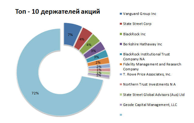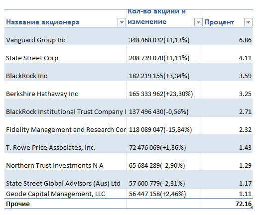 Стоит отметить, что Apple, как и большинство крупных публичных компаний, имеет очень значительный free float, то есть долю акций, которая свободно обращается на рынке и держателями является очень широкая группа людей, фондов, организаций.