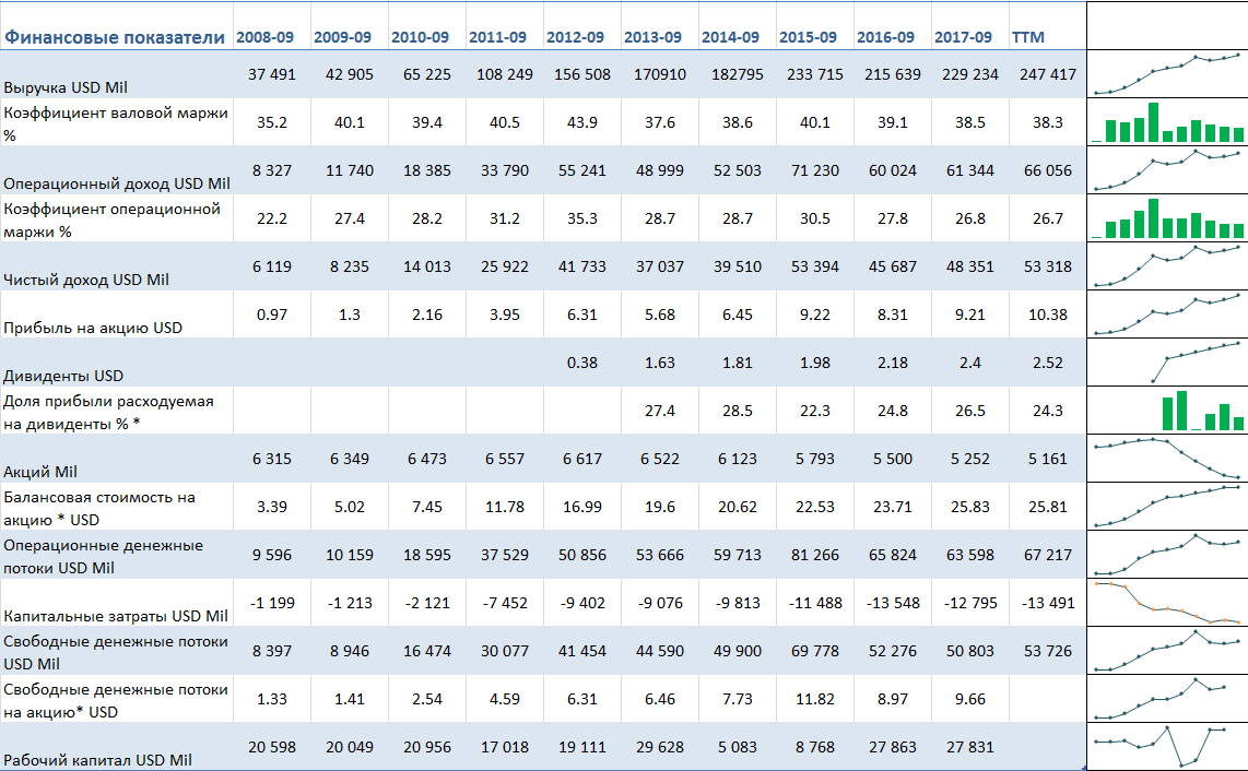 Доходы Apple Inc в 2017 финансовом году выросли на 6,30% по сравнению с 2016 финансовым годом (до 229,23 млрд. долл.). Чистая прибыль выросла на 5,83% (до 48,35 млрд. долл.).