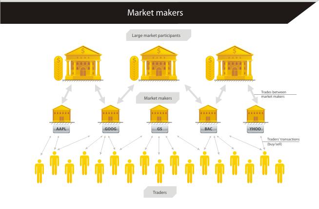 Поскольку основной объем торговых операций осуществляется через банковские учреждения, рынок Форекс называют международным межбанковским рынком. Все крупнейшие участники данного рынка (среди них такие гиганты как Deutsche Bank, USD, GP Morgan Chase и др.) осуществляют котирование и выступают своего рода «двигателями рынка» – Маркет-мейкерами, совершая сделки либо с другими банками, либо с клиентами – инвестиционными фондами, компаниями, физическими лицами. Все остальные участники рынка Forex могут называться Маркет-юзерами (пользователями), поскольку они запрашивают у Маркет-мейкеров котировки и проводят по ним свои операции (либо отклоняют, ожидая более выгодных котировок).