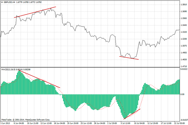 Дивергенция бывает двух типов – медвежьей и бычьей, на рисунке выше представлены оба варианта. Медвежья дивергенция возникает в том случае, когда график цены показывает новые максимумы (желательно использовать линейный график, чтобы видеть цены закрытия), а осциллятор начинает снижаться. В данном случае мы имели дело с тройной дивергенцией (три экстремума). Если трейдер был открыт на покупку – то уже на втором пике графика цены, после того, как MACD не смог сформировать рост следовало закрывать сделку (идеально конечно, ещё выше, однако цена могла начать падение без формирования третьего максимума). Сигнал же на продажу возникает тогда, когда цена пробивает минимум между вторым и третьим максимумами (либо опять же – между первым и вторым, однако пробоя не было). Бычья дивергенция возникает, если график цены стремится вниз, а MACD показывает растущие минимумы. Имеющуюся продажу следовало бы закрывать после пробоя сопротивления между минимумами (открывать покупку, в принципе, стоило бы там же).