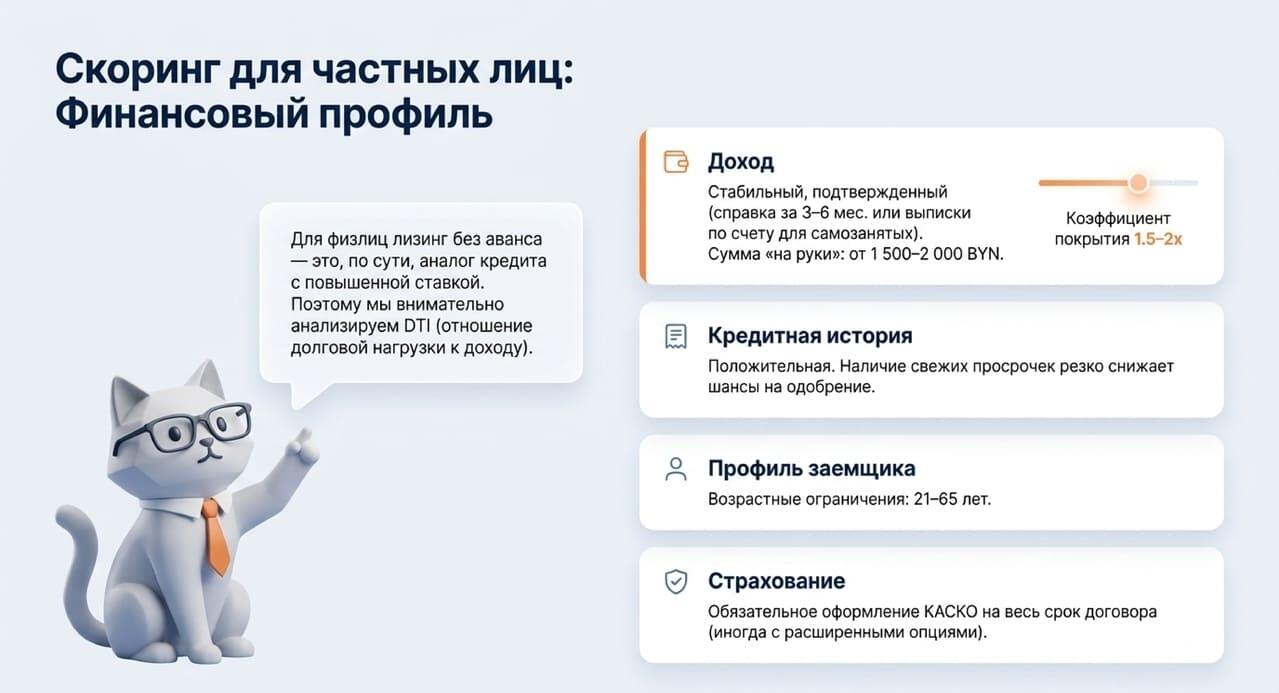 «После принятия нового закона лизинговые компании усилили требования к оценке рисков и пересмотрели условия финансирования. Это влияет на ставки и доступность программ без аванса», – комментарий эксперта Myfin.by.
