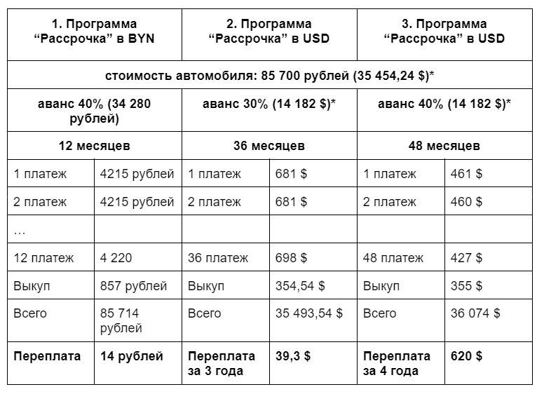 Больше всего нас заинтересовали программы рассрочки для юридических лиц. «Интеллект-Лизинг» предлагает четыре программы лизинга с минимальным удорожанием (программы «Рассрочка») для автомобилей Haval и Chery: две в белорусских рублях и две с привязкой к долларам США. Они отличаются по срокам выплат (от 1 до 3 лет), а также суммой авансового платежа (от 20 % до 40 %).