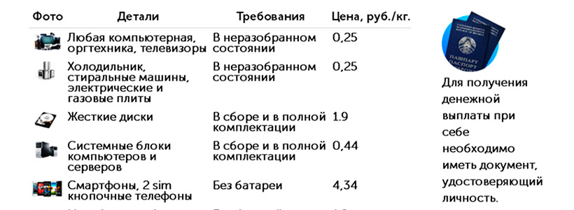 К примеру, ОАО «БелВТИ» Работает в столице и всех областных городах, по заказам вывозит технику из домов покупателей по всей стране. Организация публикует расценки на сайте: за 1 кг телевизоров, холодильников, компьютеров и др. – 25 коп., за 1 кг смартфонов – 4,34 руб., отдельные цены за жесткие диски и т.д., всего – более 10 категорий.