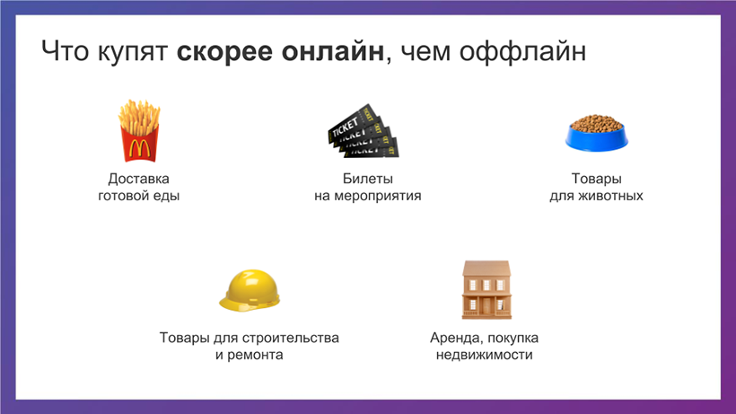 На определенные категории товаров в интернете действуют сдерживающие факторы. Многие считают, что при покупке одежды онлайн, сложно уточнить важные характеристики, а при покупке продуктов – нет гарантии соблюдения сроков и особых условий хранения.
