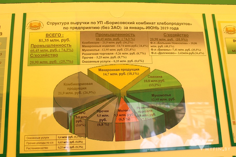 Предприятие успешно работает по нескольким направлениям. Так, у него есть 6 свинокомплексов с 119 тыс. свиней, свой комбикормовый завод, который производит по 400 т комбикормов в сутки, из них 68% идет на обеспечение своего поголовья. Макаронная фабрика производит около 40 наименований макаронных изделий и закрывает 73% рынка Беларуси по макаронным изделиям.