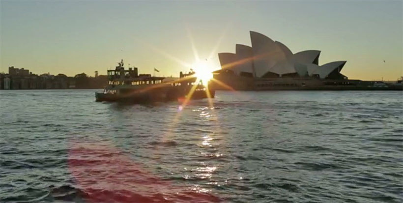 Утро рабочего дня в заливе Порт-Джексон. На заднем плане здание оперного театра. Стоп-кадр из корпоративного видео