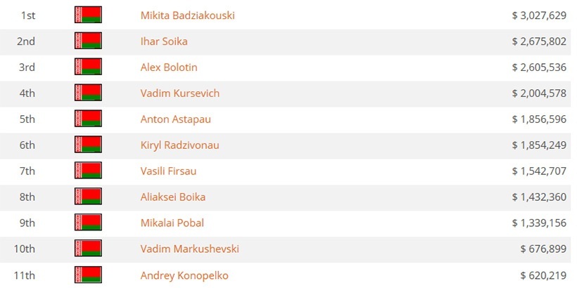 Кстати, на втором месте в рейтинге белорусских игроков – Игорь Сойка (2,68 млн долларов призовых), а на третьем – Александр Болотин (2,61 млн).