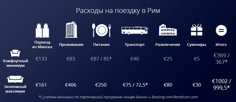 Таким образом, добраться до Рима будет стоить на человека от 133 евро из Варшавы до 161 евро из Минска.