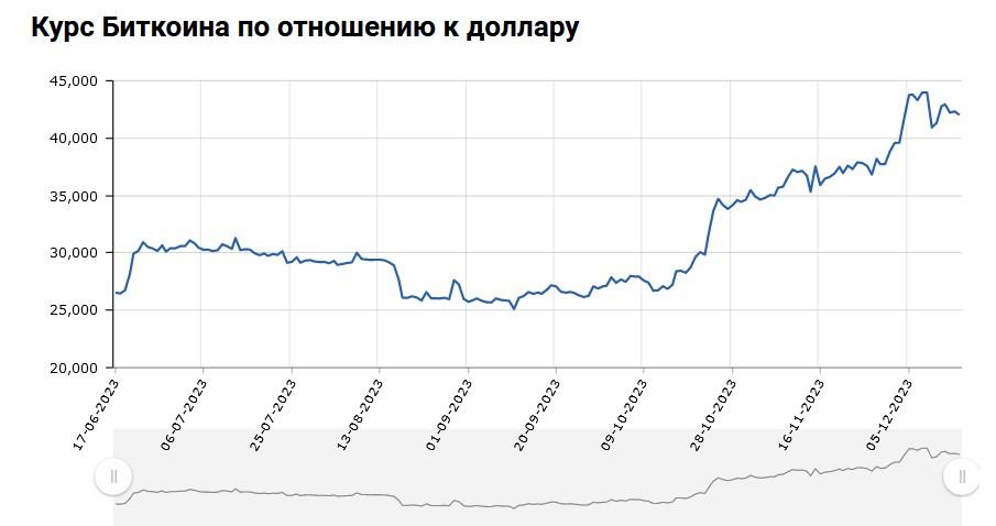 Цена первой криптовалюты взлетела 4 декабря. Биткоин впервые с апреля 2022 года превысил отметку $41 тыс. и обновил годовой максимум. Далее в декабре 2023 года стоимость биткоина, с паузами на коррекцию, достигала в моменте пика $44 тыс. Ряд экспертов считают, что биткоин в конце декабря – начале января превысит уровень $45 тыс. и может достигнуть $50 тыс.