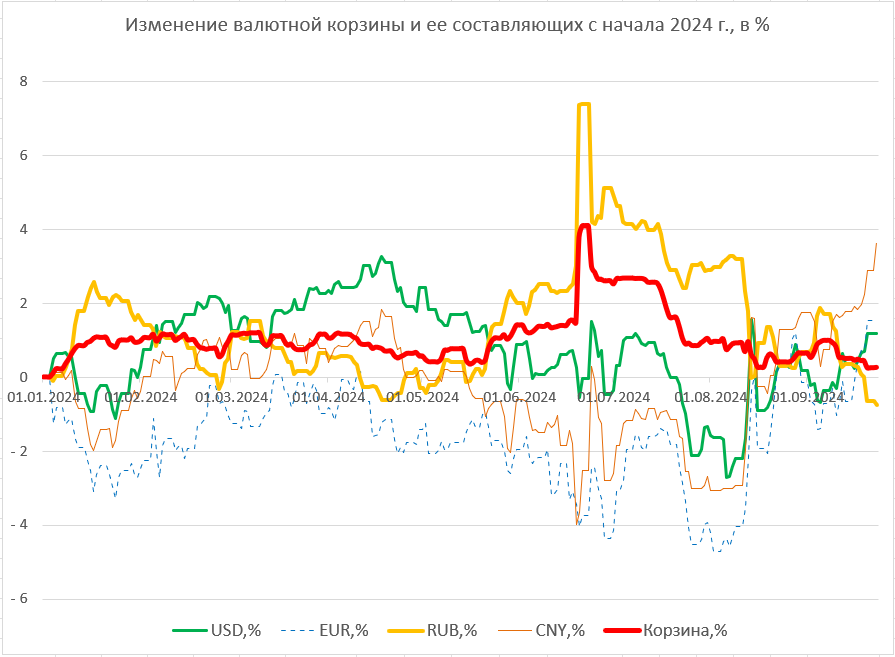 Как и неделей ранее, снижение российской валюты в составе корзины «перевесило» рост доллара и юаня. В результате корзина подешевела вторую неделю подряд, на этот раз на 0,19%, что означает соответствующее укрепление национальной валюты.