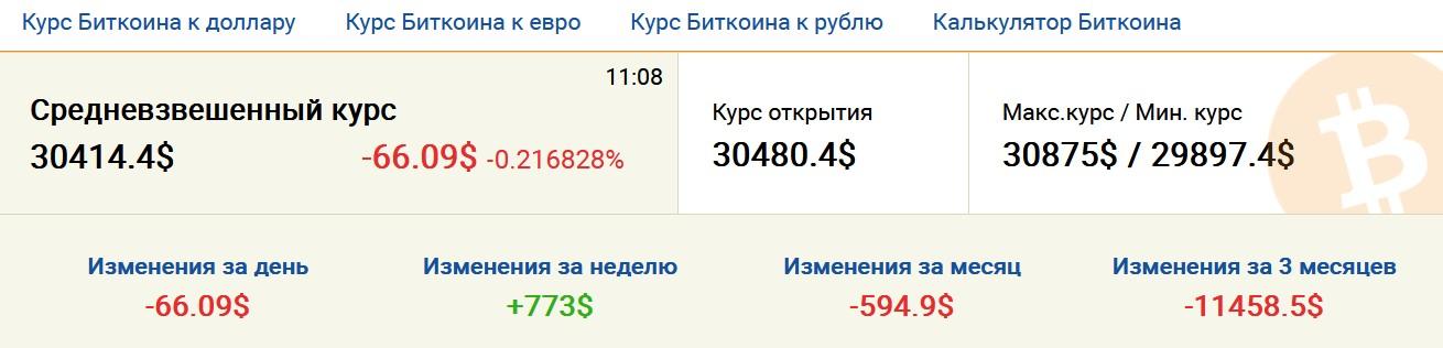 Средневзвешенный курс первой криптовалюты 9 июня (данные с сайта Myfin. by на 11:08 по Минску) составлял $30414,4. Максимальный курс достигал $30875.