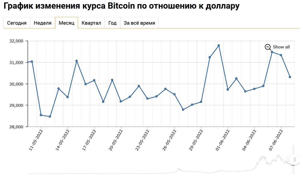 В начале июня курс биткоина упал ниже 30 тыс. долларов. Затем поднялся выше этой отметки, снова снизился и вновь преодолел уровень в 30 тыс. долларов.