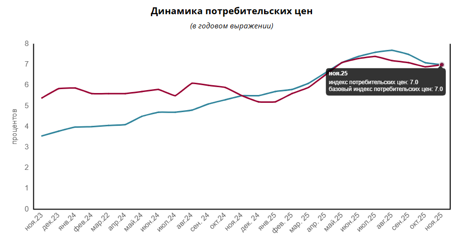 Основным параметром белорусской экономики, который находится под непосредственной ответственностью национального регулятора, является текущее изменение инфляционных показателей. Наиболее индикативный из них – индекс потребительских цен, который публикуется в месячном (м/м) и годовом (г/г) изменении. По данным за ноябрь 2025 года инфляция в Беларуси ускорилась на 0,4% в месячном исчислении и до 7,0% в годовом. При этом базовая инфляция, которая является опережающим индикатором потребительских цен, снизилась до 7,0% против 7,1% в октябре.